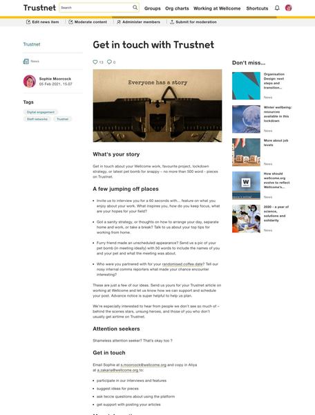 Wellcome intranet • 23 October 2020 Content Manager at Wellcome Content creation and curation working with social, external and leadership teams.